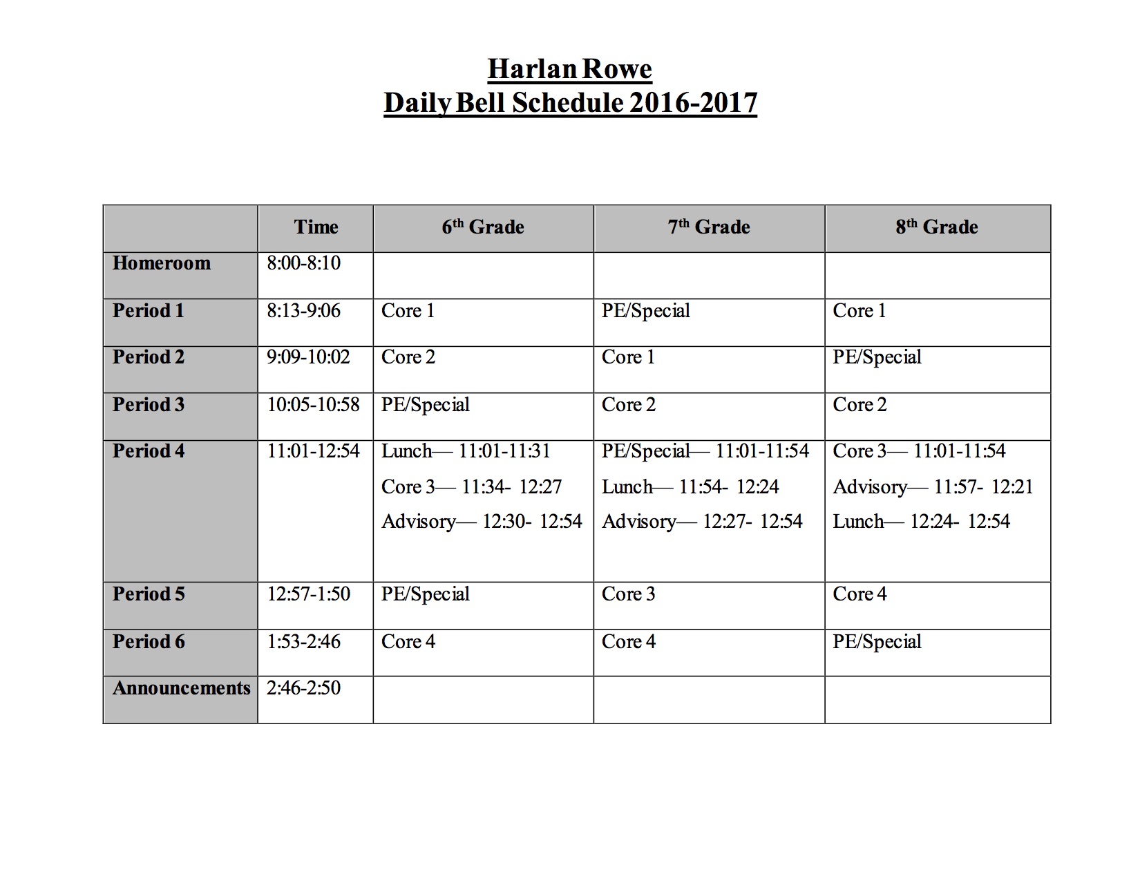 Rowe Bell Schedule 2016-17